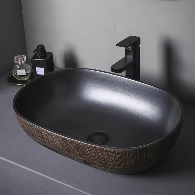 This ceramic sink stands out for its unique blend of aesthetic appeal and practical features. The high-temperature firing process guarantees exceptional durability, while the smooth surface resists dirt and stains, making it easy to maintain. Its dark brown tones and timeless oval design add a touch of sophistication to any environment, whether at home or in a public venue.