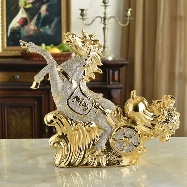 Crafted from high-quality jade porcelain, this lucky horse ornament is a true representation of elegance and craftsmanship. The beautiful gold-plated finish adds a layer of luxury, making it a standout feature in any space. With its vivid design, the ornament exudes a powerful sense of realism and movement, capturing the energy of the horse in an artistic yet refined way. The baked sand finish enhances the visual appeal, ensuring the sculpture remains vibrant and resistant to fading over time.